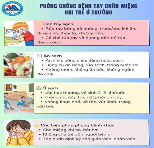 Trước tình hình dịch bệnh tay chân miệng ở trẻ em có dấu hiệu gia tăng, UBND thành phố chỉ đạo toàn ngành y tế, giáo dục và các cơ quan, đơn vị, địa phương khẩn trương triển khai các biện pháp kiểm soát, phòng chống bệnh. Sở Y tế Đà Nẵng đã kích hoạt trạng thái báo động. Tại các trường mầm non như Bình Minh, Nhà Có Nắng... việc khử khuẩn bề mặt, đồ chơi bằng dung dịch Cloramin B được thực hiện gắt gao mỗi ngày. Các giáo viên được tập huấn để nhận diện sớm các dấu hiệu "bàn tay, bàn chân, loét miệng" nhằm tách trẻ khỏi lớp học ngay lập tức.