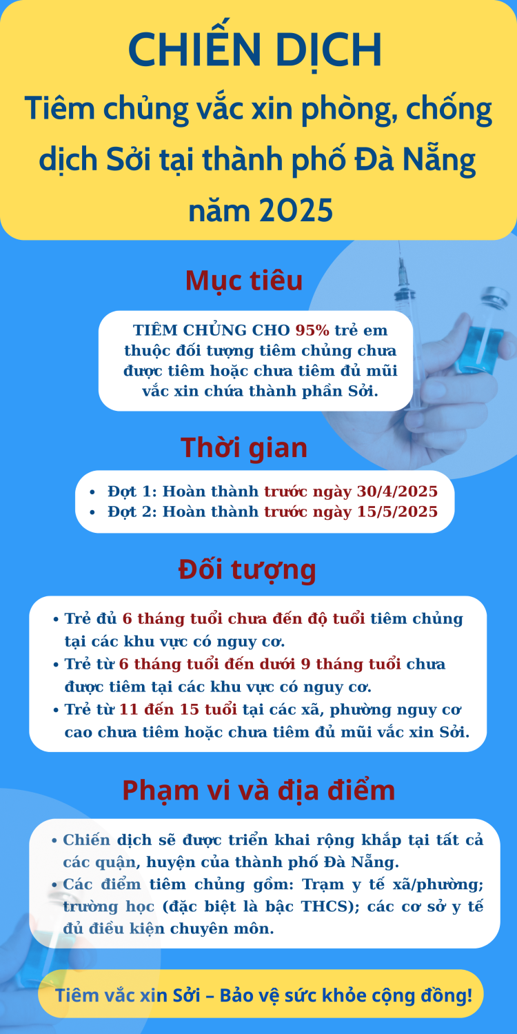 Thực hiện Quyết định số 1340/QĐ-BYT của Bộ Y tế, thành phố Đà Nẵng đã triển khai chiến dịch tiêm chủng vắc xin Sởi quy mô lớn nhằm đạt được hiệu quả cao nhất trong công tác phòng chống dịch Sởi. Chiến dịch hướng đến mục tiêu bao phủ ít nhất 95% trẻ em thuộc diện tiêm chủng nhưng chưa tiêm hoặc chưa được tiêm đủ liều vắc xin chứa thành phần sởi. Việc này nhằm tăng cường miễn dịch cộng đồng, chủ động phòng ngừa dịch bệnh, đồng thời giảm thiểu số ca mắc và tử vong do bệnh sởi trên địa bàn thành phố.