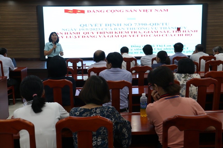 Tại Hội nghị, đồng chí Hồ Thị Lan Hương - Ủy viên Ban thường vụ, Chủ nhiệm Ủy ban kiểm tra Đảng ủy khối các cơ quan đã phổ biến Quyết định 7390-QĐ/TU ngày 19/5/2023 của Ban Thường vụ Thành ủy ban hành quy trình kiểm tra, giám sát, thi hành kỷ luật Đảng và giải quyết tố cáo của Chi bộ; Hướng dẫn quy trình tổ chức kiểm tra, giám sát tại các chi bộ.