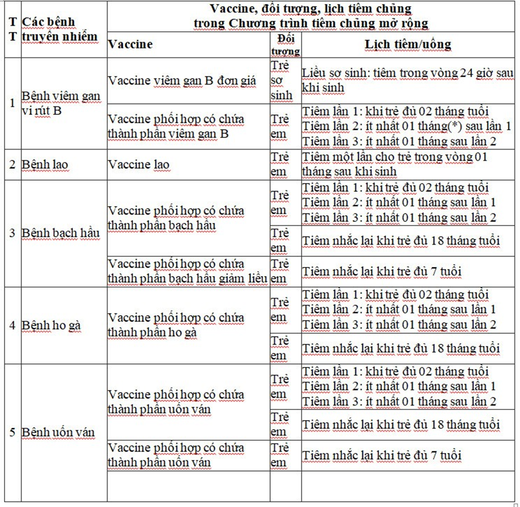 (**)Liều cơ bản là các liều tiêm trước khi đủ 01 tuổi