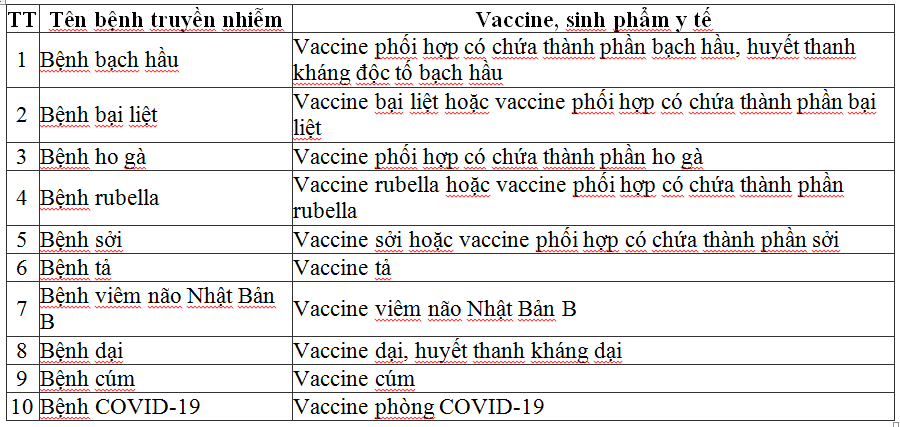 Bên cạnh đó, Thông tư cũng nêu rõ danh mục 10 bệnh truyền nhiễm, đối tượng phải sử dụng vaccine, sinh phẩm y tế bắt buộc đối với người có nguy cơ mắc bệnh truyền nhiễm tại vùng có dịch hoặc đến vùng có dịch: